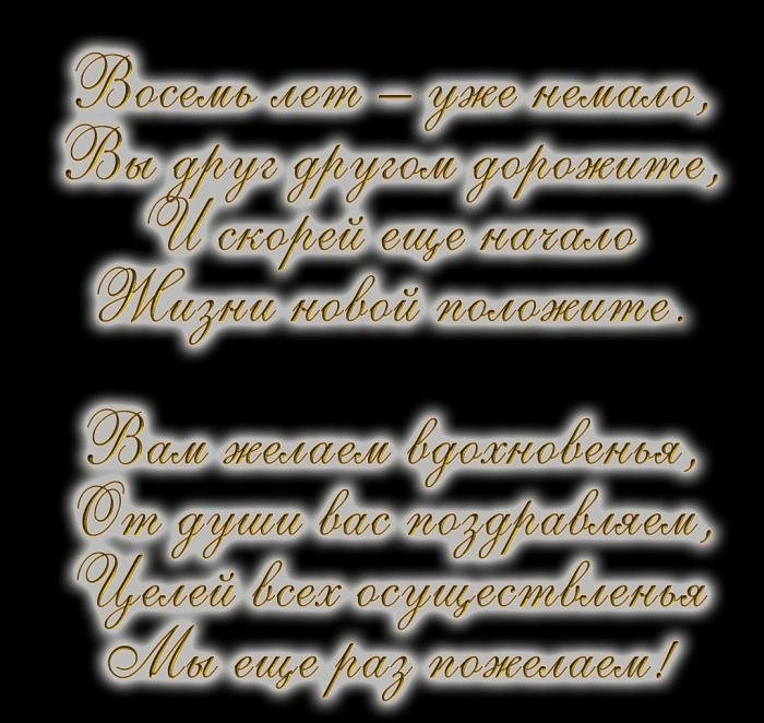 Мелкой пылью станут свадьбы 4 годамогу, точно!Пожелаю тебе счастья8 Лет свадьбыдороже нет.Поздравления с днём