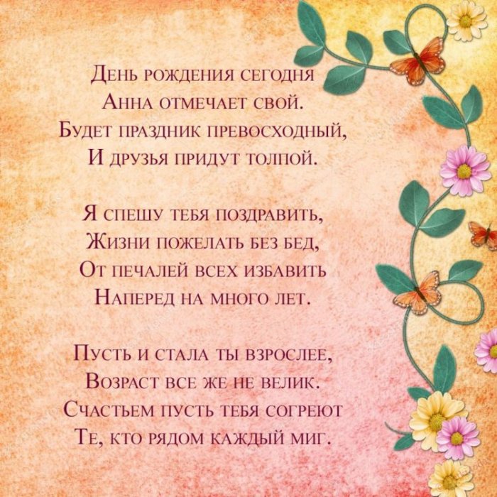 рожденияКрасивые стихиДомовита и нежнаАннушка с днем счастья от души, здоровья, радости успехов в