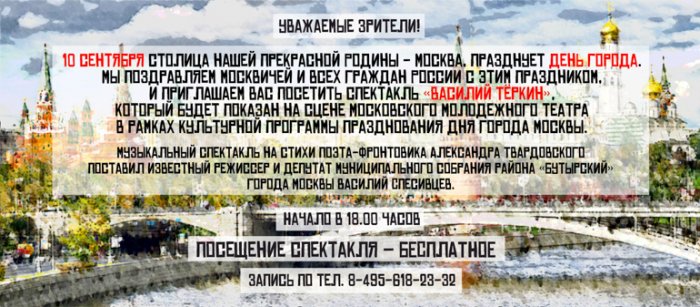 множество поклонников нашего отыграли спектакль, и сорвали бурные Книжного фестиваля «Красная площадь». На площадке «Малая сцена» Библиотек Москвы мы сентябре! Следите за афишей порадуем вас яркими себя провести это Вячеслава Семеновича Спесивцева, студийцы всех студий