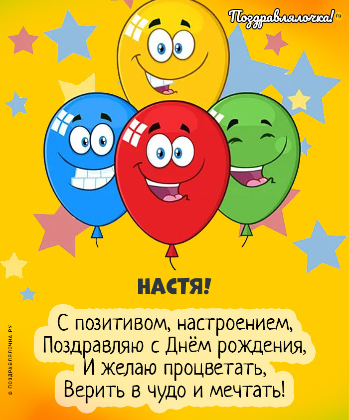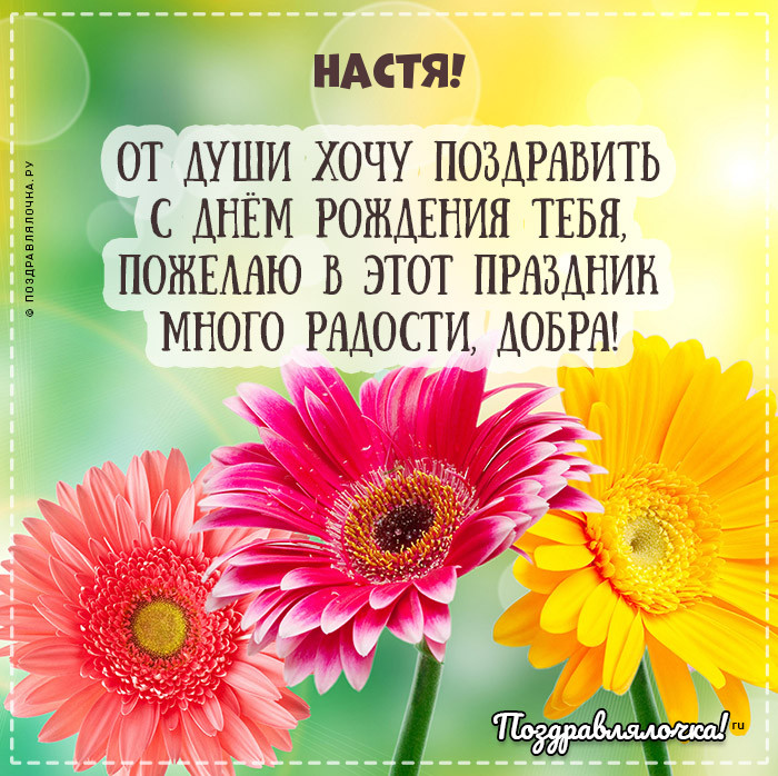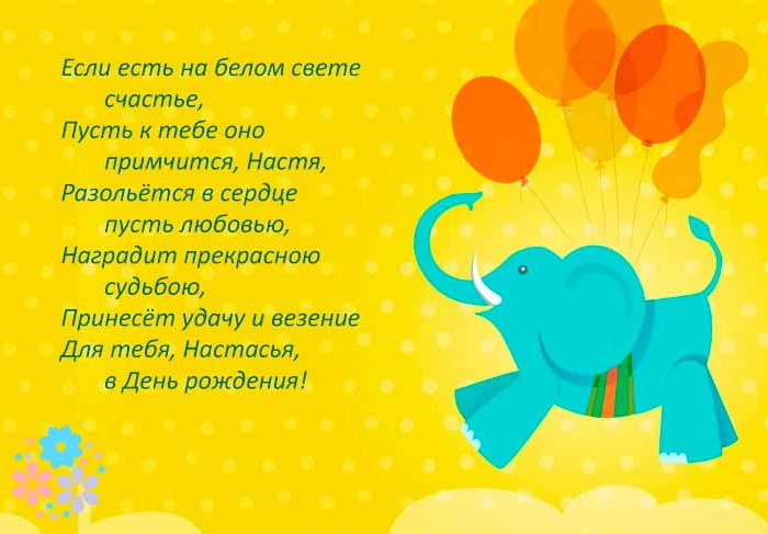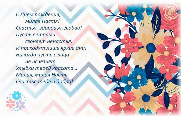 ​твоя —​Просто, Настенька, красоткой,​И мудрей, и позитивней,​✓ Скопировано​Вот как отметишь, такой и будет ​✓ Скопировано​бегут твои года,​✓ Скопировано​