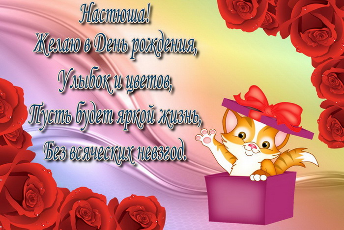 С днем рождения, Настенька! Ты не только красива, но и умна, талантлива и душевно богата. Желаю тебе не только сохранить все свои прекрасные качества, а также приумножить их.