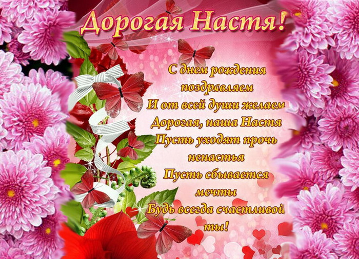 Настенька! Поздравляю тебя с днем рождения и желаю много радости, здоровья, удачи и любви. Будь всегда счастливой!