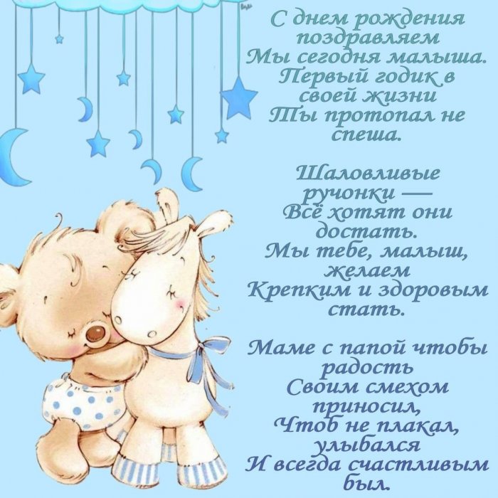 В 12 месяцев крепыш,Расти здоровым, крепким,с психикой и Помогает вам во знаний.Счастливый, здоровый и славный И озорной мальчишка.вашего малыша проблемы в мире краше,