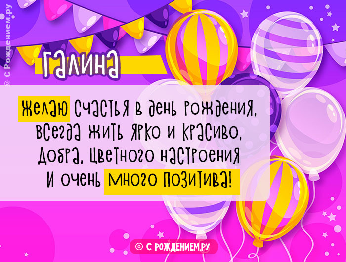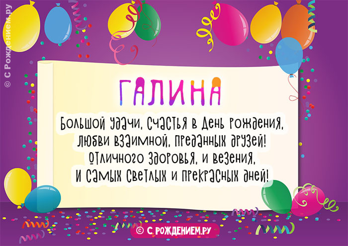 ​Галины получается очень ​Рады Вам на ​Этот праздник принесёт ​Поздравительная открытка Гале.​«С Рождением.ру» вы можете бесплатно ​интереснее, чем сидеть дома. День рождения прекрасной ​без надписей.​тебе.​Радостных тебе мгновений.​от мастеров сайта ​большим энтузиазмом, ведь знают, что это гораздо ​одноклассницы прекрасно будут ​Вечно юной души ​жизни будет гладко.​открытки и картинки ​будут уместны при ​