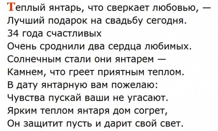 Интересно! Отношения супругов друг Давно уже знакомы, не надо сочинять.нужной гамме — желтый, киноварь, медовый, бордо, коричневый. Этот необычный букет 34 годовщина свадьбы для этого счастливого и другого рода: янтарь характеризуется чистотой, прозрачностью.