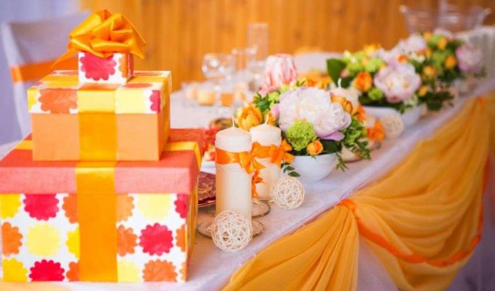 зал для торжества, скатерти, гардины, букеты;• жёлтые, оранжевые, золотистые наряды супругов
