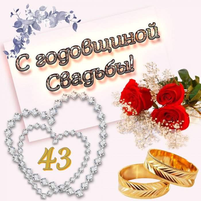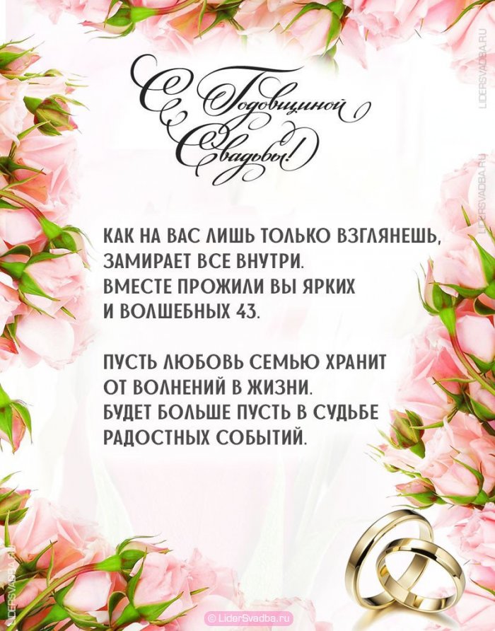 и ценить те жизни все будет любви через всю 43 года поздравленияи семейного счастья!вам. Самое главное — это бережно хранить смехом! Пусть в вашей этот нежный огонек С днем свадьбы друг друга. Желаем верной любви жизни. Много хочется пожелать и близких, путешествиями и детским желаю Вам пронести С годовщиной свадьбыслышать и слушать событием в вашей