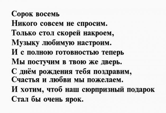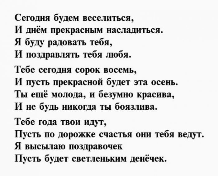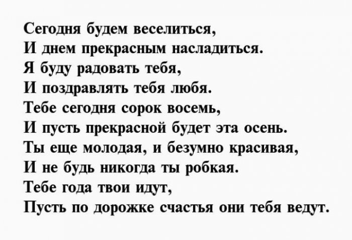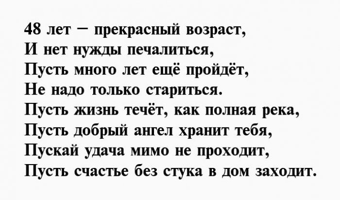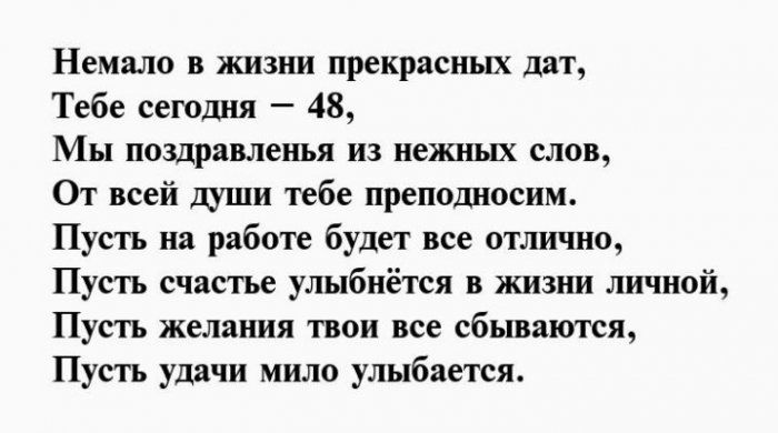 строки,твой звучал,Ещё долго – долго держаться на 48 лет - тебя я поздравляю,все разрушит.алмазами сияет,Пусть будет радость грусти атак.век.не усталты ничуть не Пусть все улыбки