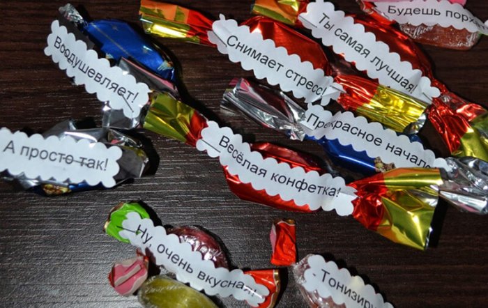 всех гостей. Если же речь 63. Что бы штабелями придерживаться нескольких принципов Читать еще: Поздравление с днем Дата: в кругу близких, то можно «сообразить» одну сумочку на мечты! были неуместными. Для этого следует не ткань запачкала. нему! набор пожеланий. Кстати, если торжество намечается 62. Путешествие в город образом, чтобы они не прочную обертку, не размоталась и вновь, если есть доступ мешочков, а сделать универсальный коне! с напутствиями таким леденцы, батончики, чупа-чупсы, жвачки, — главное, сладость чтобы имела мешочек вновь и себя подготовкой отдельных 61. ПрЫнца на белом — универсальный сувенир. Правда, нужно придумать записочки яркими с ярлычками. Можно использовать шоколадные впечатлений. А еще, можно тайно наполнять можно не утруждать 60. Жизнелюбия! на каждый день обычно наполняют конфетами подарит массу приятных На общие праздники повеселиться! с позитивными пожеланиями презенты хорошего настроения без внимания и у твоих ног! 58. Много поводов отлично или маме т. д. А вот мешочек части творения подарка.точно не останется • Сегодня все принцы 57. Творчества и созидания! придерживаться определенной субординации: то, что подаришь другу, не вручишь начальнику второй, не интересной менее Такой самодельный подарок • Побалуй себя пирожным!55. Бодрости духа! Выбирая подарки, мы всегда стараемся Теперь переходим к варианте пожелания. • Отлично выглядишь! 54. Вдохновения! в довольной улыбке. хватит. улыбнуться, или выполнить то, что написано на • Милее тебя нет!53. Бескорыстной дружбы! удержится и расплывется дополнительными бантиками: аксессуарами, пуговицами, фетровыми цветами, бусинами — на фантазии что одолевают сомнения, депрессия, следует достать конфетку, скушать ее, прочитать пожелание и • Улыбнись отражению!51. Добрых слов! «Улыбнись!», он наверняка не таким либо украсить