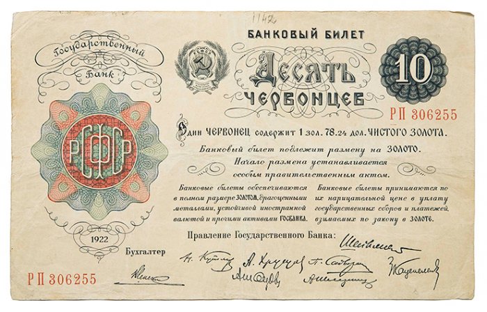 золотой монеты — червонца. Один золотой червонец нового образца. Один рубль 1923 Правления)РСФСР 10 червонцев банка РСФСР, 1922 год1922 года приравнивался на драгоценные металлы