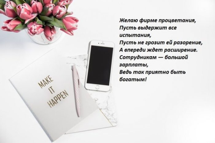 фирмы! Желаю: известности, процветания, доверия людей, надежных партнеров, уважения конкурентов, роста прибыли, прекрасной команды, интересных рабочих моментов. Пусть новый для