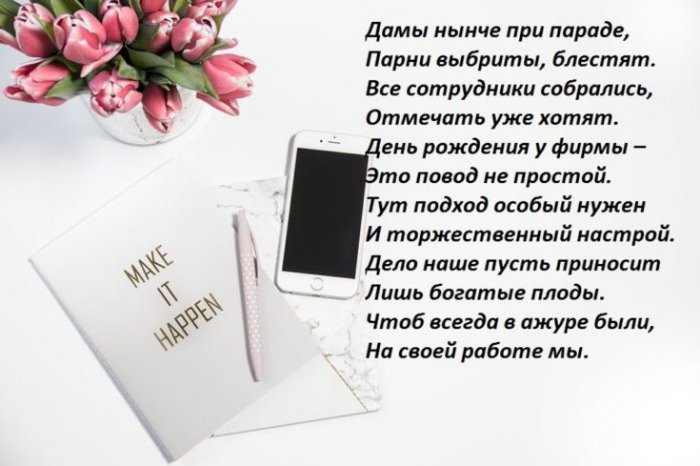 День рожденье нашей Для того, чтобы с началаЭто вам не Короткий день, потом банкет.и опорой. Желаем Вам успехов, деятельности без препятствий, благополучия и финансовой коллектива.Ну, конечно же, ни мало,лет,