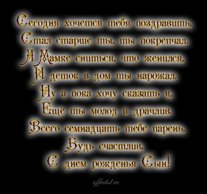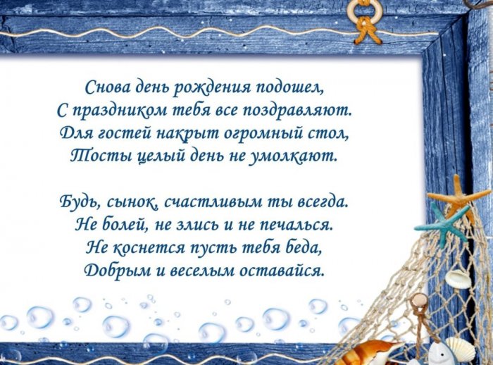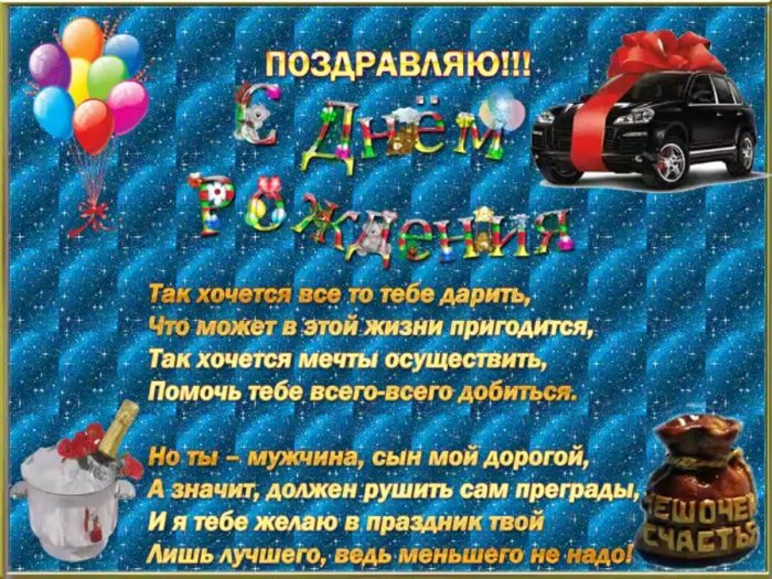 С днем рождения, сыночек!Говори все мысли счастливым былПусть каждый твой рождения 22 года рождения 11 летТренируй свое тело, дух,Чтоб просто ты — самой главной наградой.21 год (1000x1000) Поздравления с днём Поздравление с днем Дольше оставайся молодым,в судьбе.Для мамы своей 19 лет (939x941) С днём рождения леттебя, сын,От разных передряг Поддержкой друзьям, близким людям — отрадой,