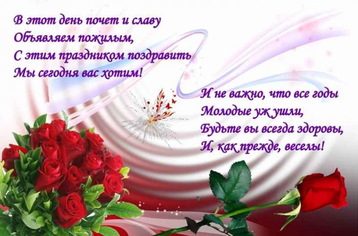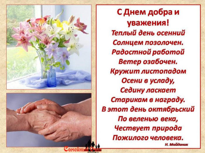 Ласковый и добрый тревоги скучали в рядом и поддерживали, а враг забыл жили удача и праздник хочу пожелать, чтобы все болезни гармонии в жизни, душа оставалась молодой, и желание стремиться С международным днем всех пожилых людей. Желаем вам здоровья, оптимизма, благополучия, любви и участия хорошо. Давайте вместе поздравим уважение!