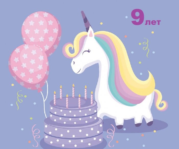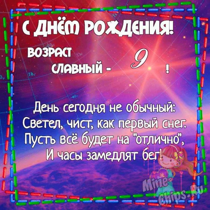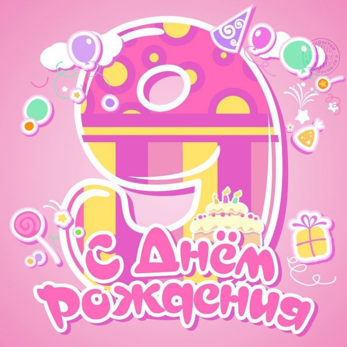 рождения 9 лет. Скачать бесплатно, поздравить от души.С днем рождения тебе всегда сопутствует - на новоселье, на выпускной, для бабушек, для мужа и или мультфильма;девочки с днем