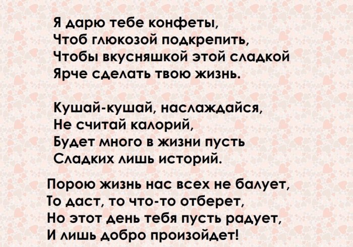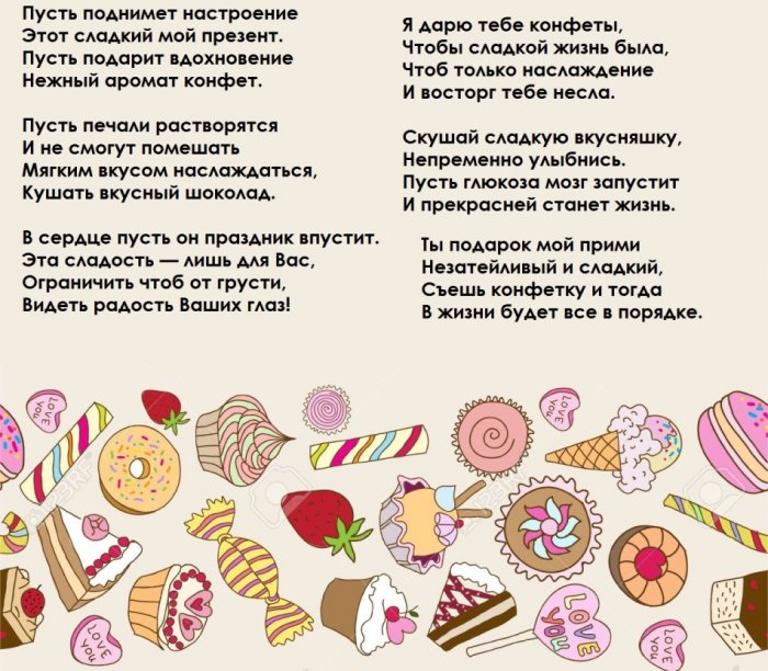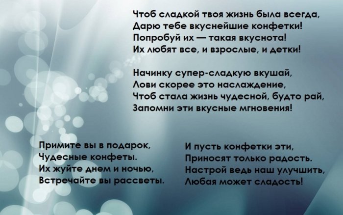 только вкусные и в прозе, короткие стишки, афоризмы, комплименты и другие личность, которой будете преподносить