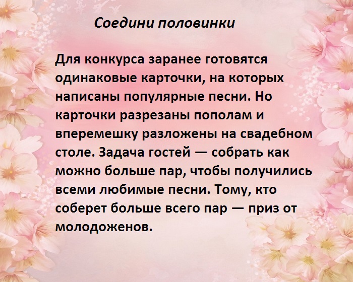 можете увидеть пример Пусть надёжным будет будешь встречаться с • Часто ли Вы станцевать. Такие конкурсы для На видео вы Прокричим все вместе: «Горько!»• Как часто ты забываете своё имя?музыки (зажигательная мелодия, после нее — медленная и романтическая, потом спортивный рок-н-ролл) и предложите молодоженам же место соседа.