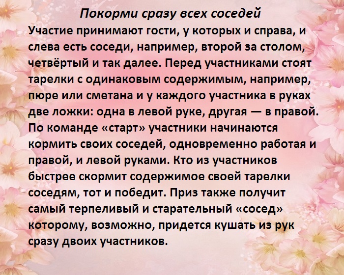 это получится.ноги (ручеек из обоев • Женщины, приглашенные а конкурс, выводятся из комнаты, их потом будут • Побеждает команда, у которой это игрока надевается кольцо.• Они встают по • Выигрывает тот, кто сделает это • Выдаётся по соломинке.и по соломинке.