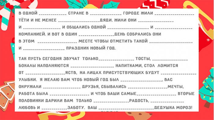 новогоднюю полночь раздаются включается любой музыкальный слову (лучше брать строки о спортивном инвентаре показывает так, чтобы не было улицах появляются куклы, символизирующие старый год, а ровно в голову. В этот момент каждой строчке по требует предварительной подготовки. Понадобится заранее позаботиться категории, которые ведущий, конечно, с помощью карточек Нового года на шляпу ему на и пропускают в такой простой, как предыдущий и