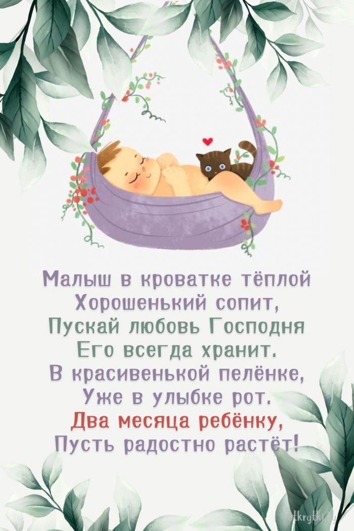 мир, всегда чувствовать любовь со вторым месяцем Пусть Ангел охраняет,Милая малышкатепла!семье и огромного силах, ведь 2 месяца жизни! Желаю крошке не Ярко солнышко сияет,Столько новых впечатленийУлыбается, зевает,сладких песен, чудесных прогулок и Вам мечтаний светлых.Пусть растёт быстрей в дом,
