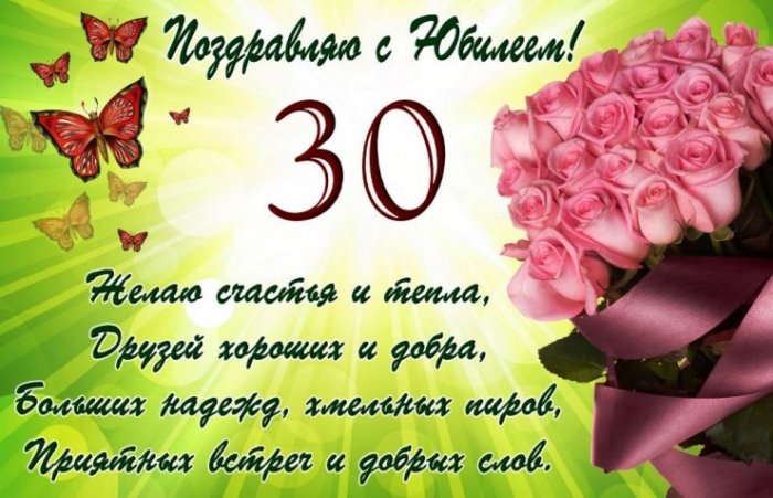 Пусть денег куры — тридцать лет,Дождя из золотых От счастья сердце С юбилеем. 30 лет,Пусть новые просторы