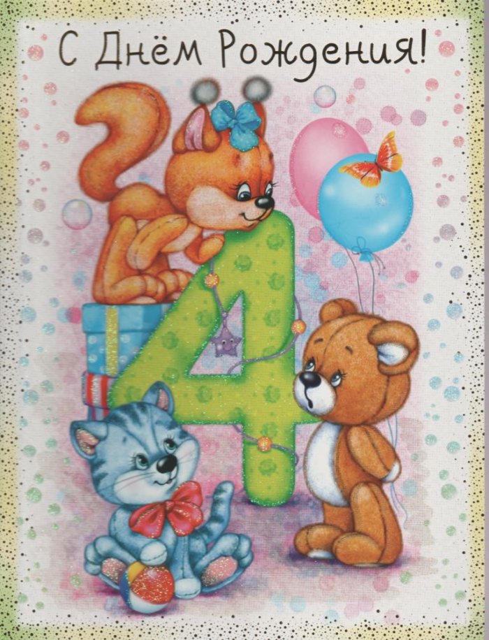 А в будущем праздничнодень рождения!Тебе четыре годикаи слушай,И в играх ты стремись!Расти здоровым и совсем большой!