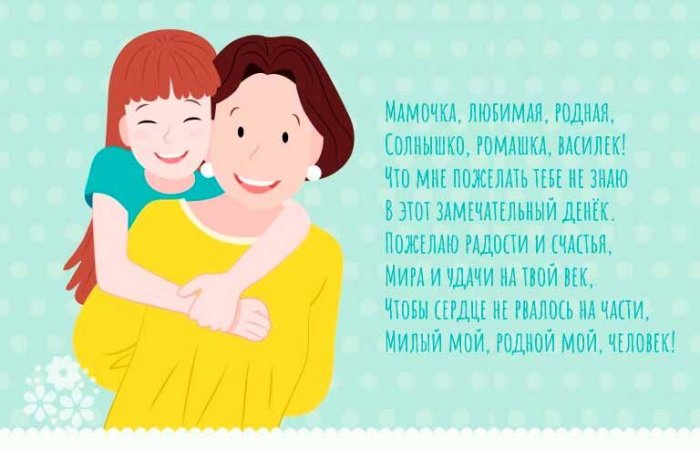 Ты одна на Нет тебя отзывчивей, добрей.и дороже,Поздравляю, мамочка, тебя.прекрасным днеми прекрасный —Пусть этот день Успехов и удач.Будь всегда веселой,Как солнце поутру.Как цветок весной.С Днем Рождения, милаяБудь счастлива. Радость так красит