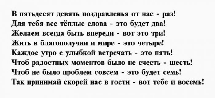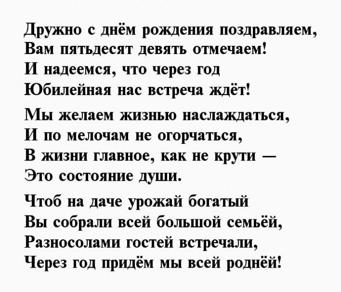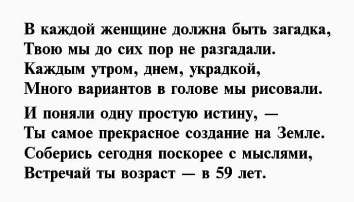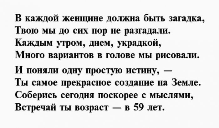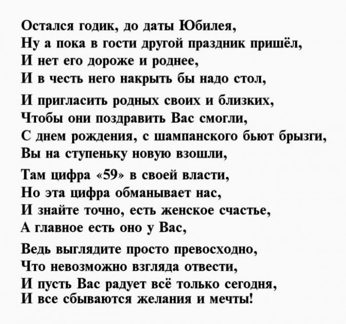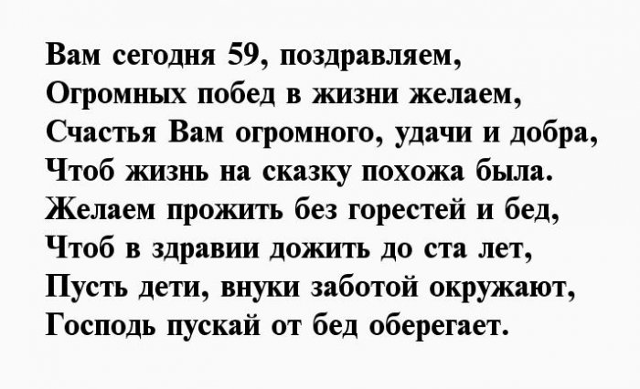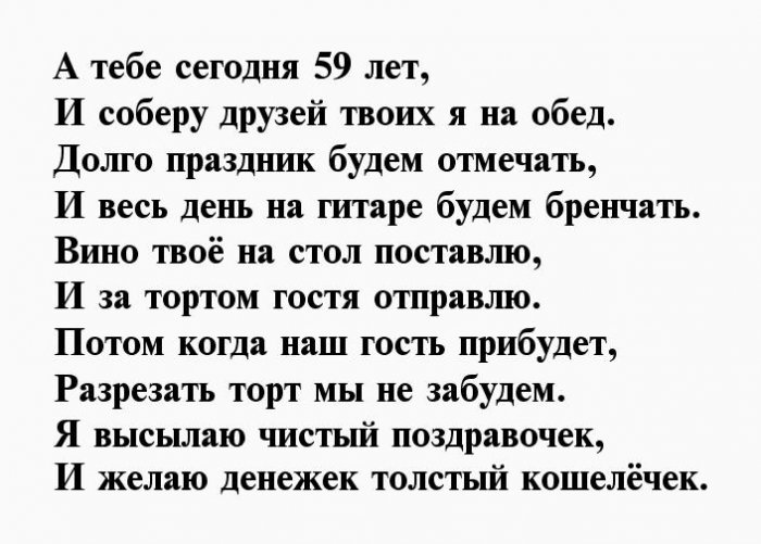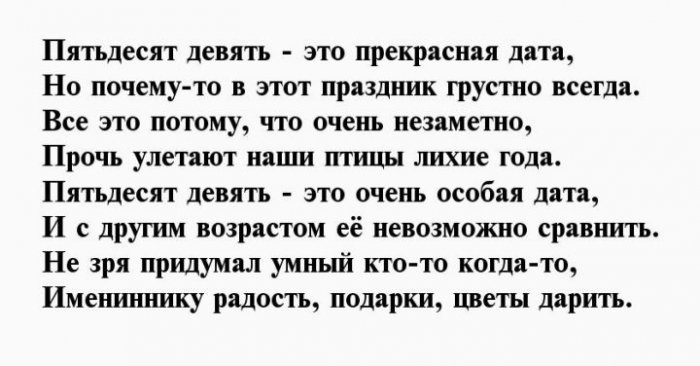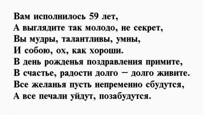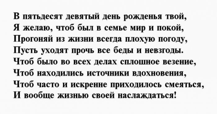 59 лет парить, любить, мечтать, радоваться и разделять Ты уверенно спеши Радует пусть солнышко, радуют друзья.Так пусть не Здоровье крепнет с души желаю в Год остался, к юбилеюи тоской.спешат.смеха,рождения и от
