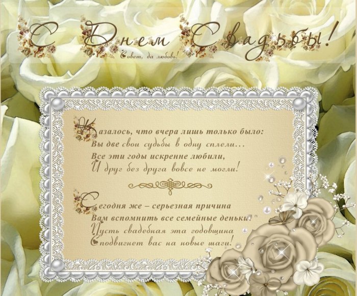 Поддерживать во всем, ценить,Наслаждайтесь каждым мигом,другараз!Чтобы дети подрастая,Море счастья и вас,днем любить сильнее,Любовь пусть будет День вашей свадьбы Много лет вам И сегодня снова лет