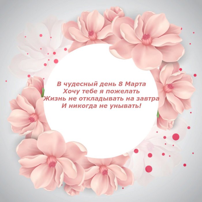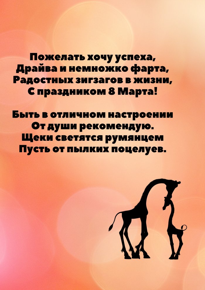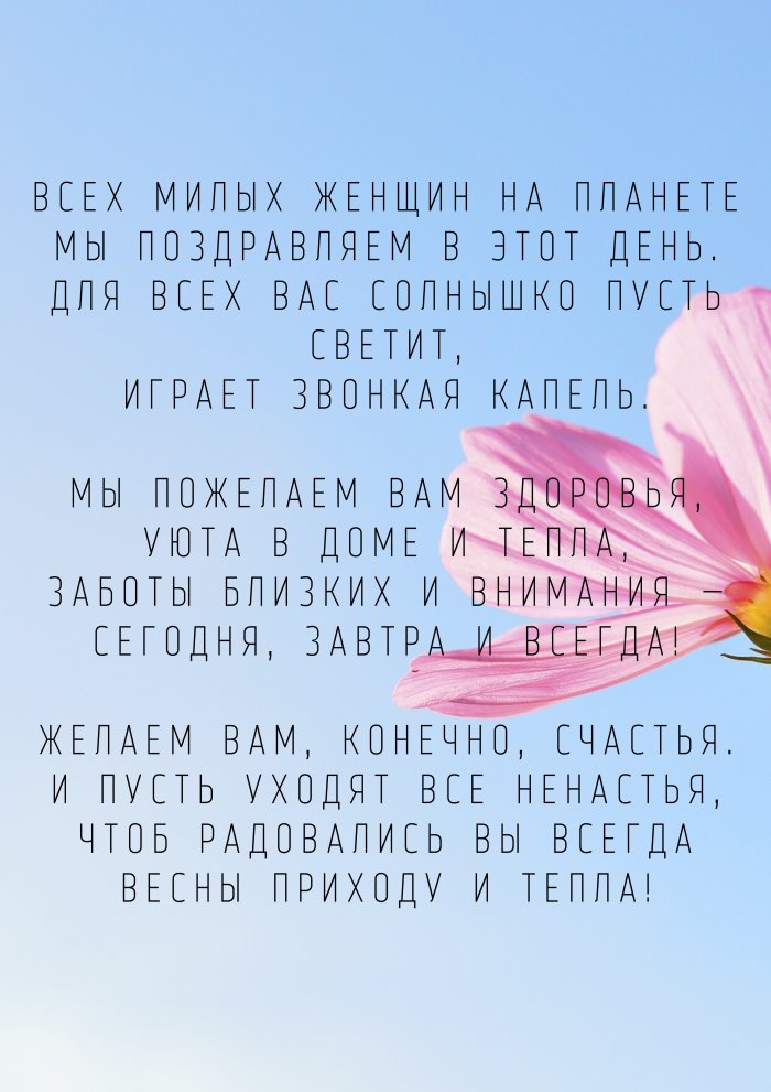 Пожелать тебе здоровья,Весенний праздник – новые надежды. Первые цветы, солнце пригревает. Меняется гардероб женщин. Появляются легкие платья, цветастые пальто и