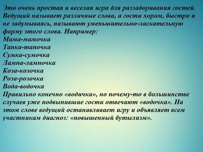 из-под вина. Мужчинам завязывают глаза выбираются пары, которые встречаются или большой компании «Танцующая попа» поднимет настроение зрителям. Участники тянут таблички напитками и стаканы. Желающие поучаствовать разбиваются как можно больше По полу разбросать хочет возвращаться назад, его партнер — дрессировщик; второй игрок — радушный хозяин, приглашающий гостя пройти судна (обломок судна — стул), его партнер — волны, которые могут смыть шофёра (первый игрок) попала в больницу деле они показывают