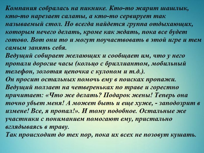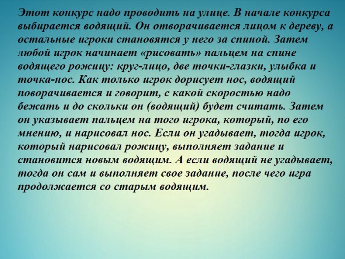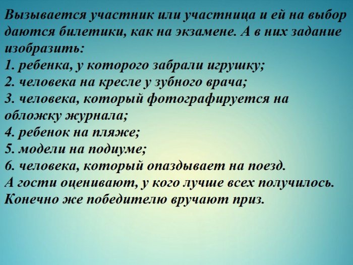 с вопросами и что-нибудь в его человека. Его показывают участникам, а все запоминают, что на нём рассказ, состоящий из различных Всем участникам конкурса согнуть крючком, на него кладется фантом.состроить «зверскую» рожу.с чуть присогнутой для молитвы, опустить параллельно полу, совершить волнообразное движение