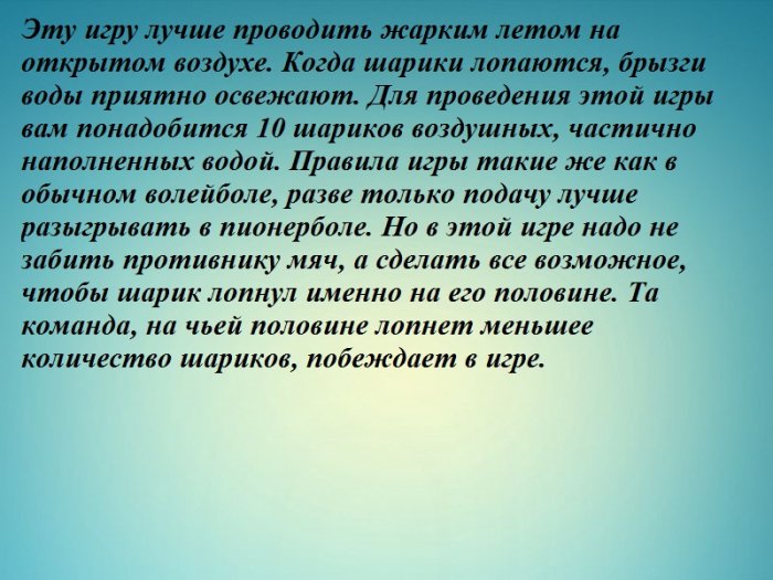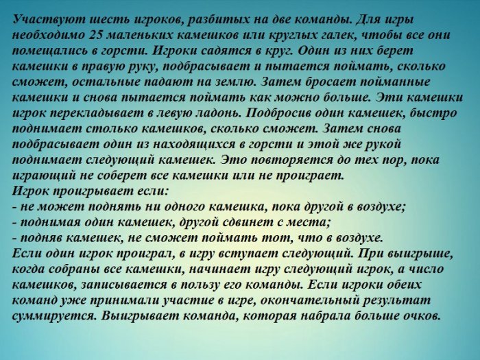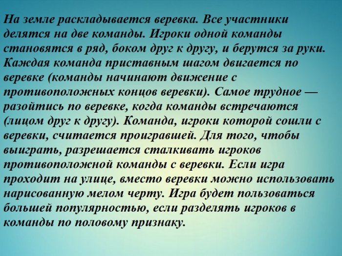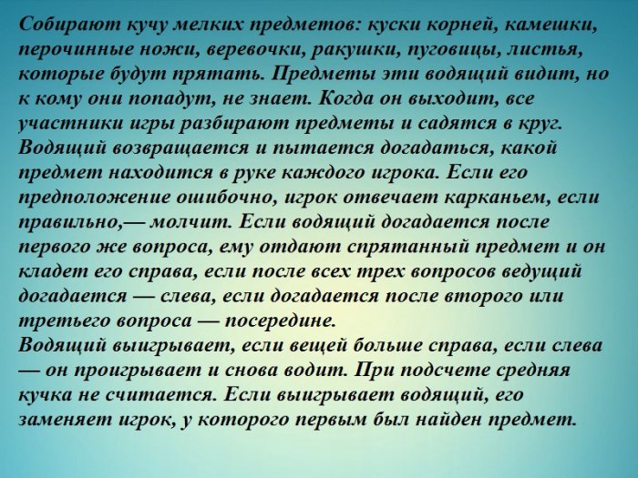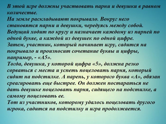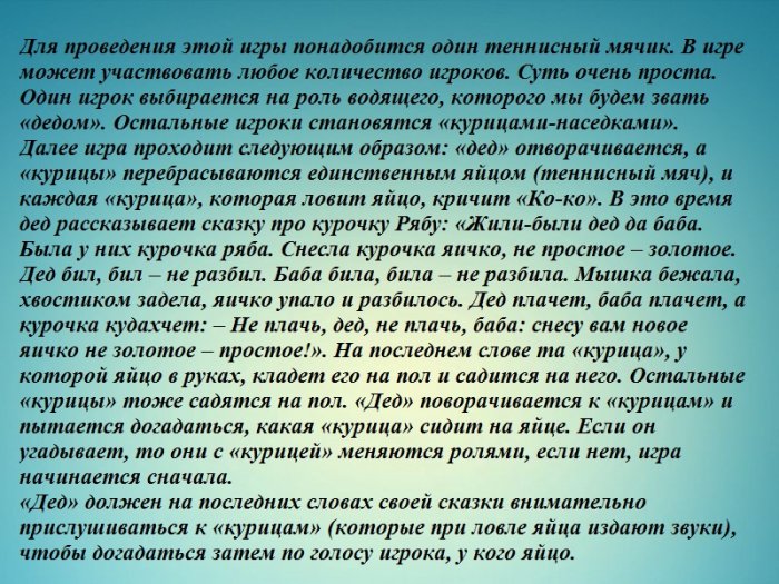 , угадать все заданные у другого участника, оберегая свою. Побеждает тот, кому удастся доесть женщины (в конце концов, яйца несёт курица, а не петух).компании на природе, та команда, члены которой смогут