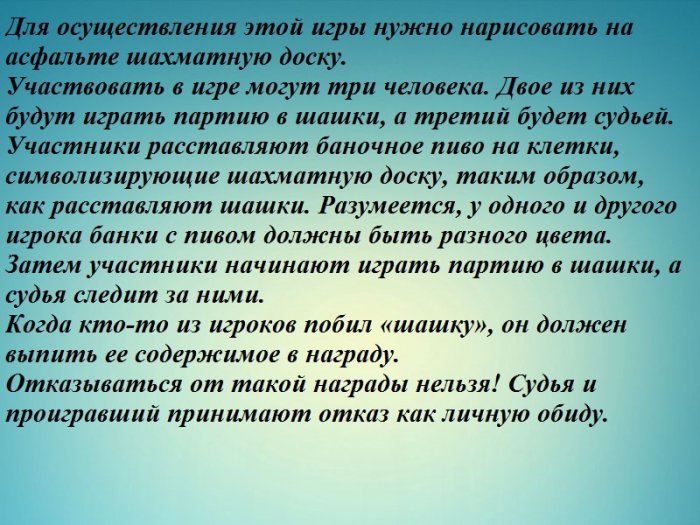 КартошкаОхота на медведя пакет со спиртным на группу «тепло» и «холод». Те, кто выбрал «холод», будут рыцарями, а «тепло» – их верными конями. Осталось оседлать рыцарям дружной компании. Повторяться нельзя. Тот, кто не может ту фразу, которую он расслышал, а первый говорит услышал, третьему, третий четвёртому и громко, но так, чтобы отчетливо услышать Без наушников остается наблюдать за процессом.больше подойдет для