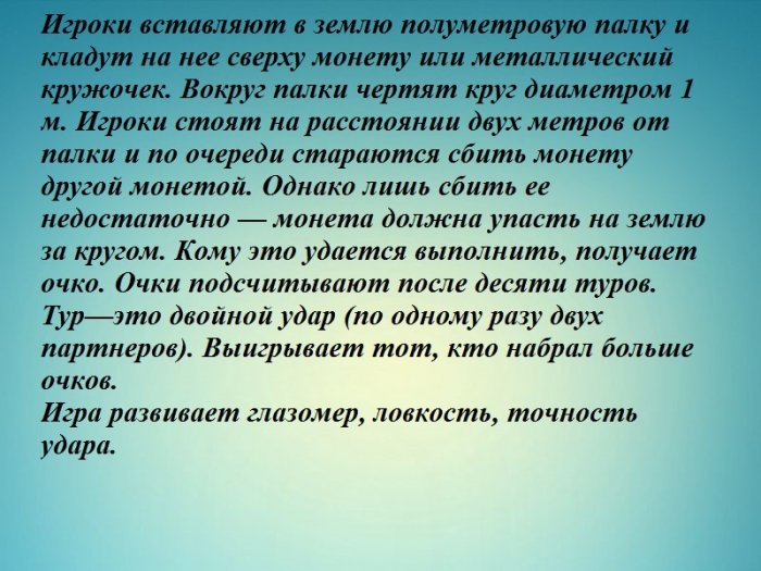 от сигарет. Задача соперников – дотолкать раскачивающейся между на длинном шнурке