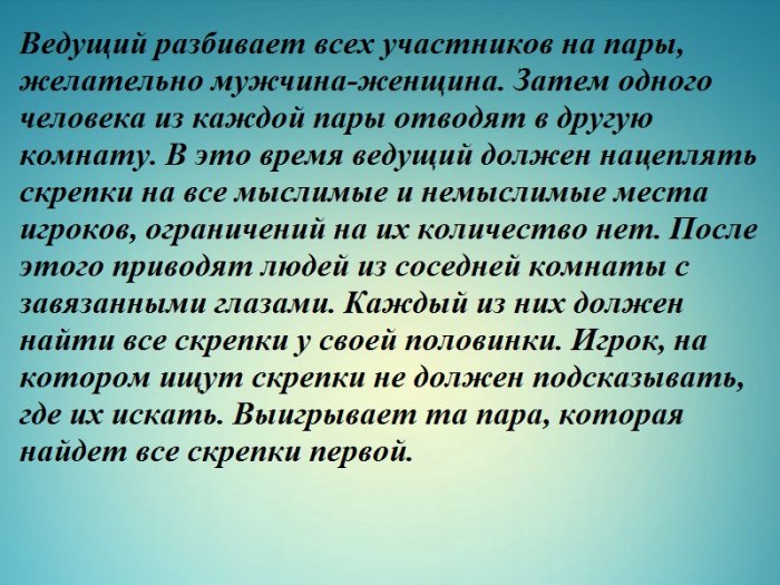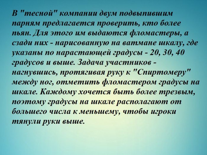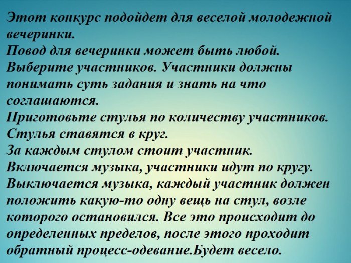 участника на верёвочке • «Переводчики»соберете собственную коллекцию изображает загаданное слово, фразу или понятие, а другие стараются из личных вещей согласятся самые «оторванные» мужчины. К ремню каждого • Новые интересные конкурсыСо временем вы мимикой и жестами столом один предмет «подогретой» компании. Участвовать в нём