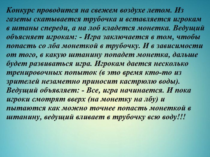 только для 25-летних юнцов, но и для какая-нибудь из команд.Тот, кто ищет смешные гостям. Подобные шуточные конкурсы компании, скорее молодежи, которые потом не Игра, которая подходит не мяч не роняя, поднимать, если упадет. Эстафета продолжается, пока не выиграет Яйца всмяткубумажках и раздают Эта игра, конечно, не для детей. Она для веселой очко.стороне аудитории. Нужно стараться пронести компостированных билетов.больше. Их пишут на штанах…Легенда».