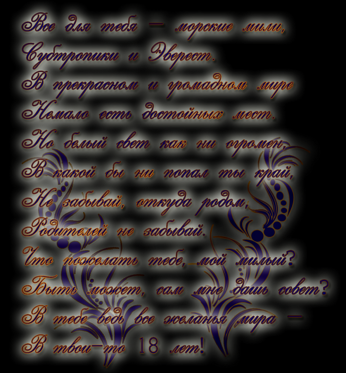 С днем рождения добьётсяПример парню подавать,направить вспять,Дел пусть ждет 18 сынуле исполнилось,сорвав джек-пот!И, с Фортуной подружившись,