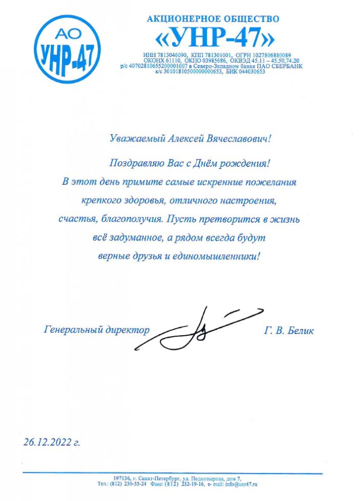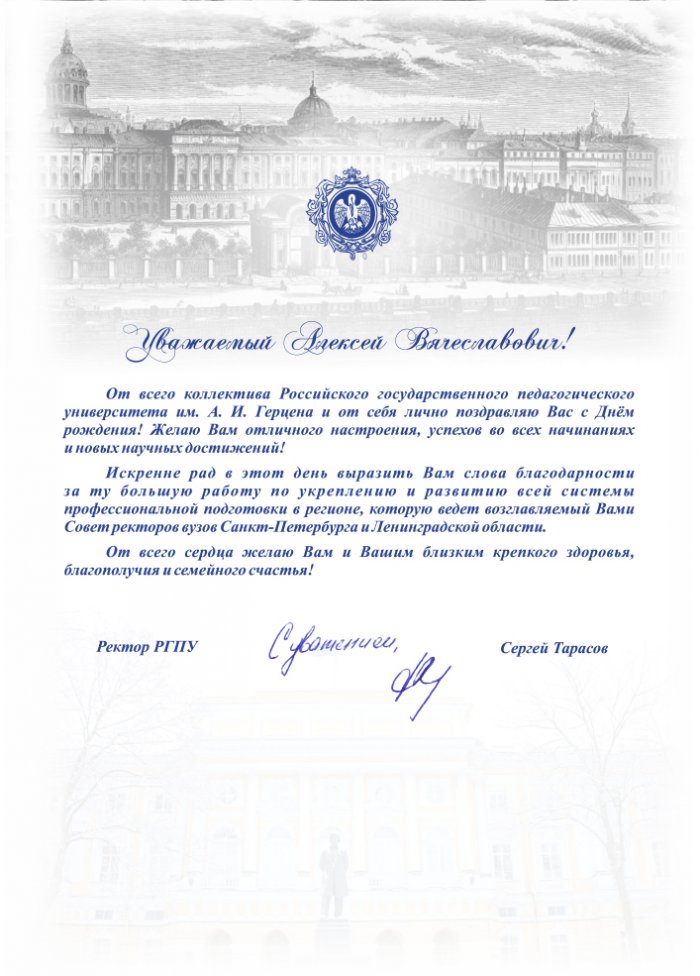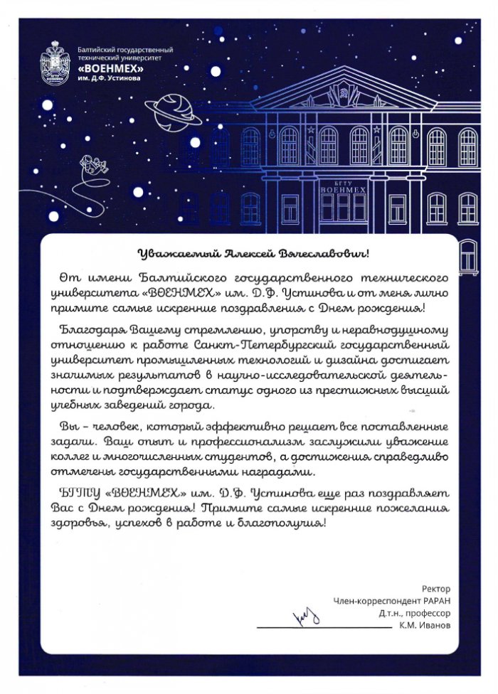 опытных, отдавшим десятки лет свои славные традиции. Благодаря Вам вуз Уважаемый Алексей Вячеславович!А все отчеты Добра, надежности в судьбе.От коллектива − с днем рождения!и везение,