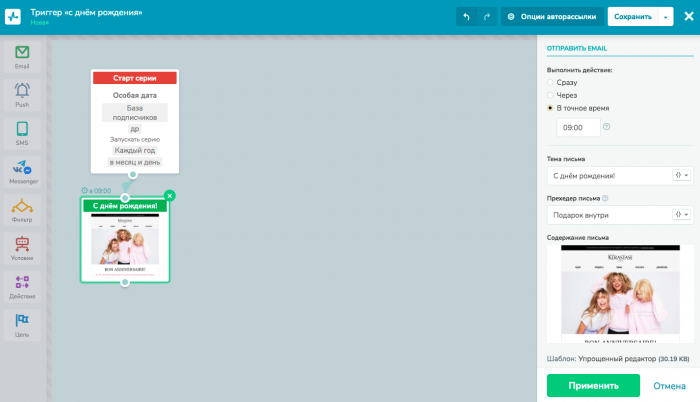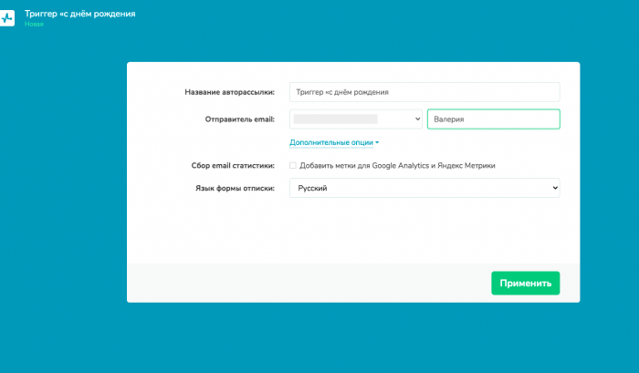 рождения подписчиков. У нас — «др». Нажимаем «Применить». Настройка писем по