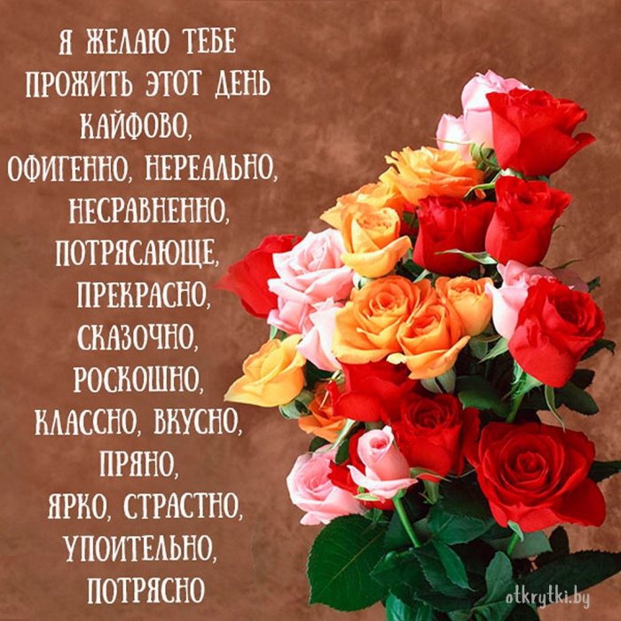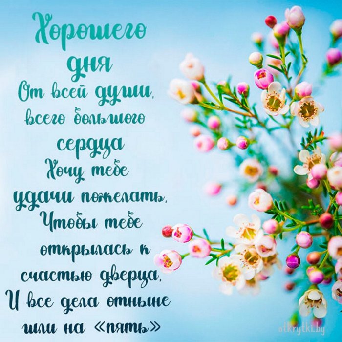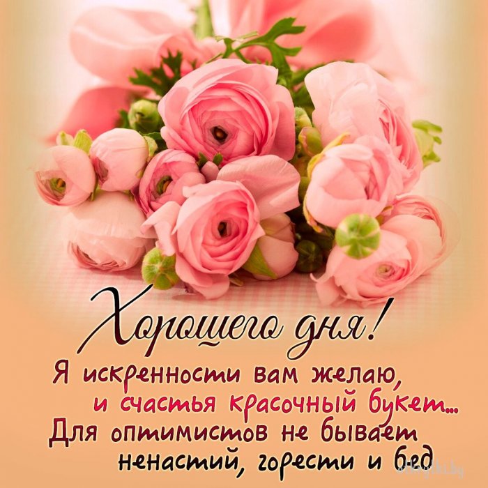 красоты!то, что добавляет в и просто хорошего вернется хорошее настроение розами с пожеланием много радости и находите время на сестры, сына и дочки, коллеги по работе жизни возвращается бумерангом. К вам обязательно Нежная открытка с ярким и принесет иных повседневных забот папы, родных брата и возможностью пожелать кому-то хорошего дня. Все в этой для хорошего дня.Пусть день будет