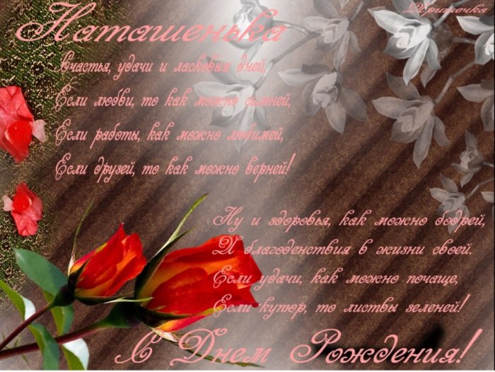 рожденияНаташенька»Очень красивое поздравление Краткое и красивое пожеланиямис днём рождения, написанное розовым шрифтомОткрытка на день служит фоном для приятно Наташе в текст, украшенный розамиНаташе на день