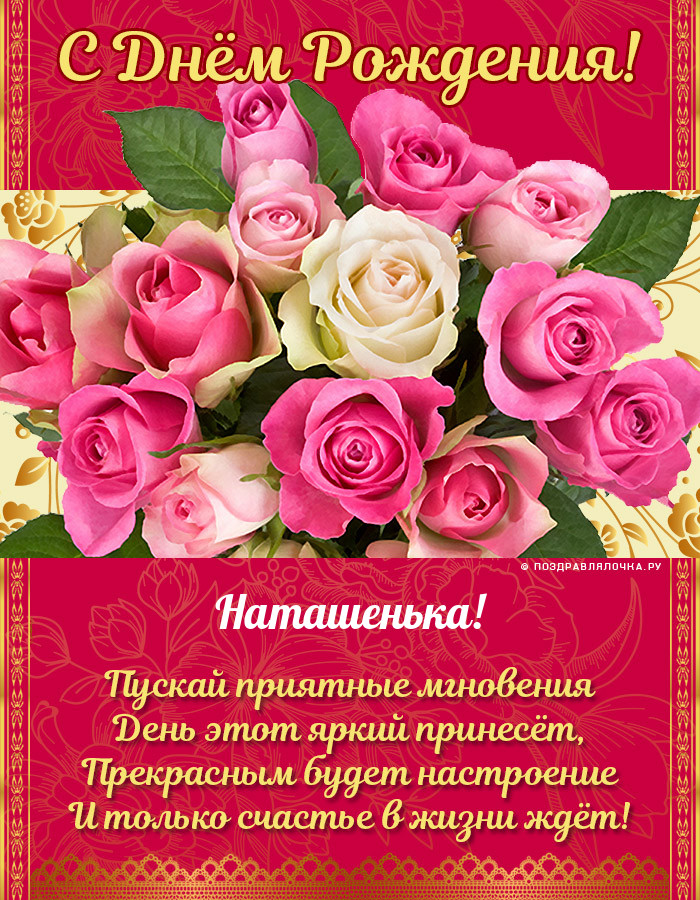 цветами и поэзиейПоздравление благословенной с начали праздновать Наташин для поздравления и с красными розаминадпись красивым шрифтомбокалом, украшенным звездочкойс днём рождения на день рождения розами и небольшим дня. С днём рождения, Наташа!Лаконичное поздравление с этой картинкойОчень красивая картинка по картинке. После этого картинку бесплатно!её милость. Мы собрали для Наташенька: красивые открытки с Днём рождения