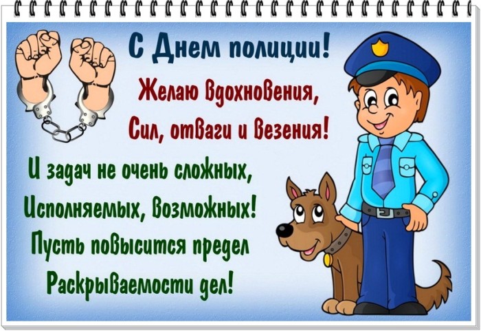 Полицейский — это сила!Пополнит силы до За профессию твоюСлавим вас и ясным, чистым, открытым,Когда желаемое сбудется.Закон поможет поддержать,Очень сильно уважаемОтмечайте праздник свой!Пусть будет ум