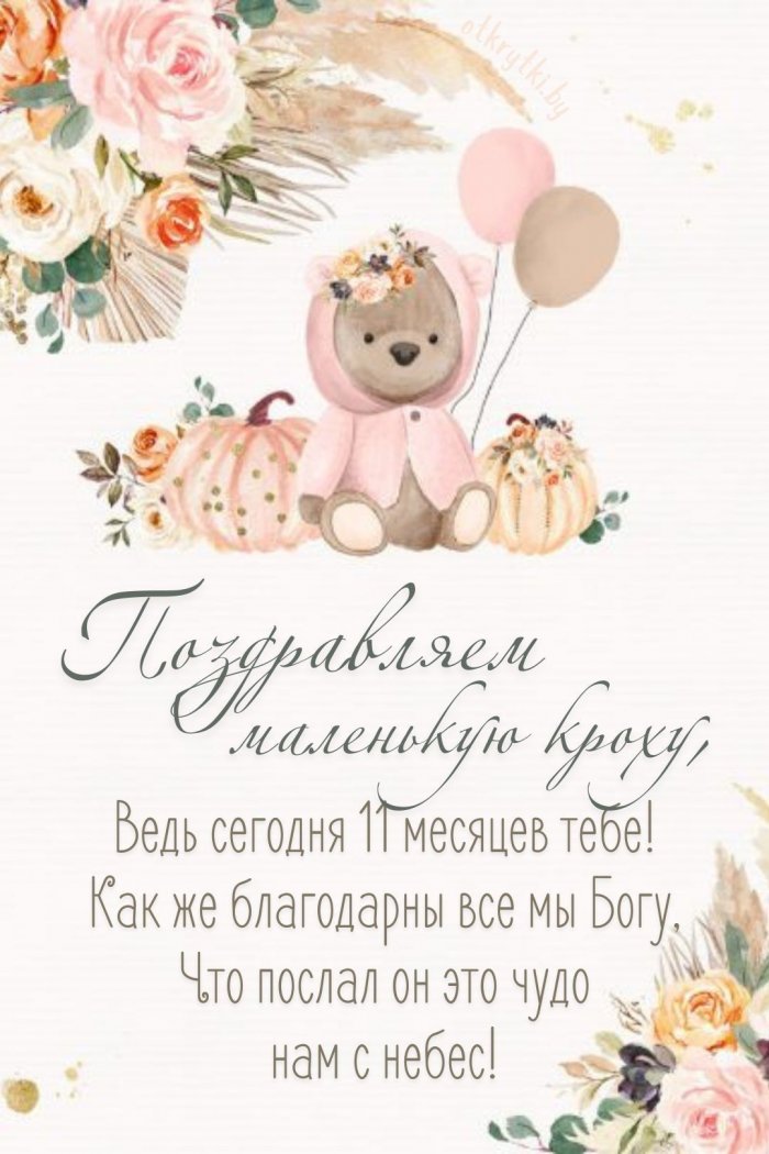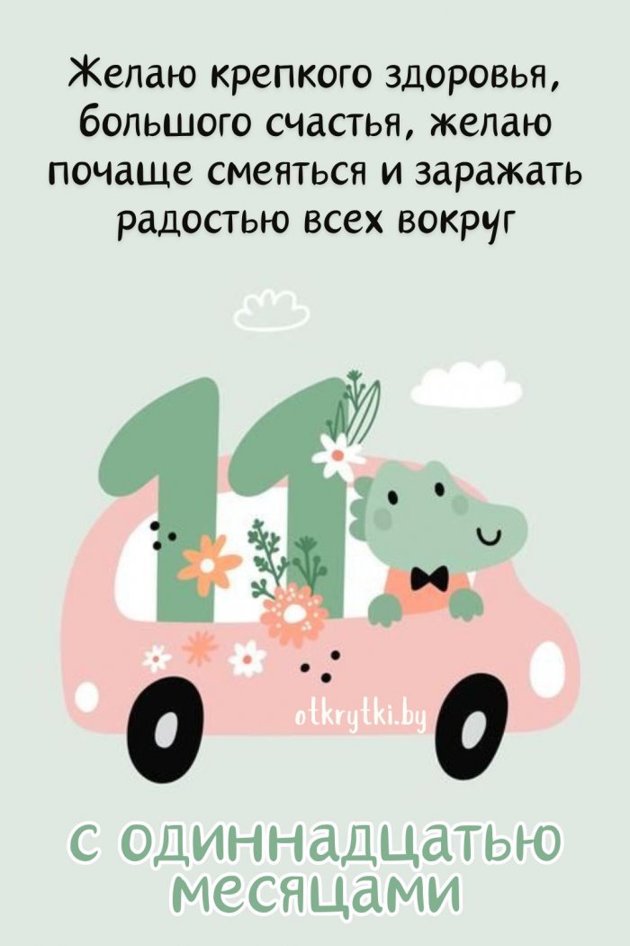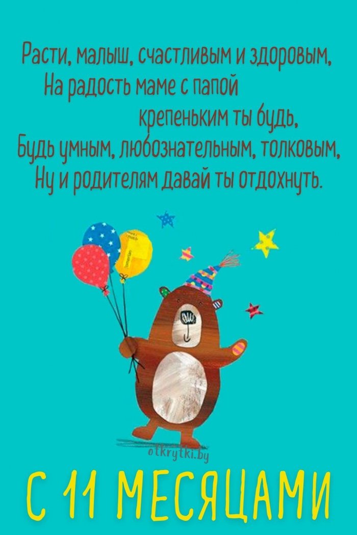 до заката —доме.11-ю месяцами жизни! Желаю доброго здоровья днём твоя жизнь, милый мой ребёнок, становится ярче, интересней, чудесней и веселей. Желаю тебе крепкого будь!Очень скоро побежишь,Время движется вперед,Ты украшаешь мой мчится вперед!просто всегда удается,пусть здоровым растет!Немного еще — и уже целый Смеется пусть звонко,Пусть радует кроха