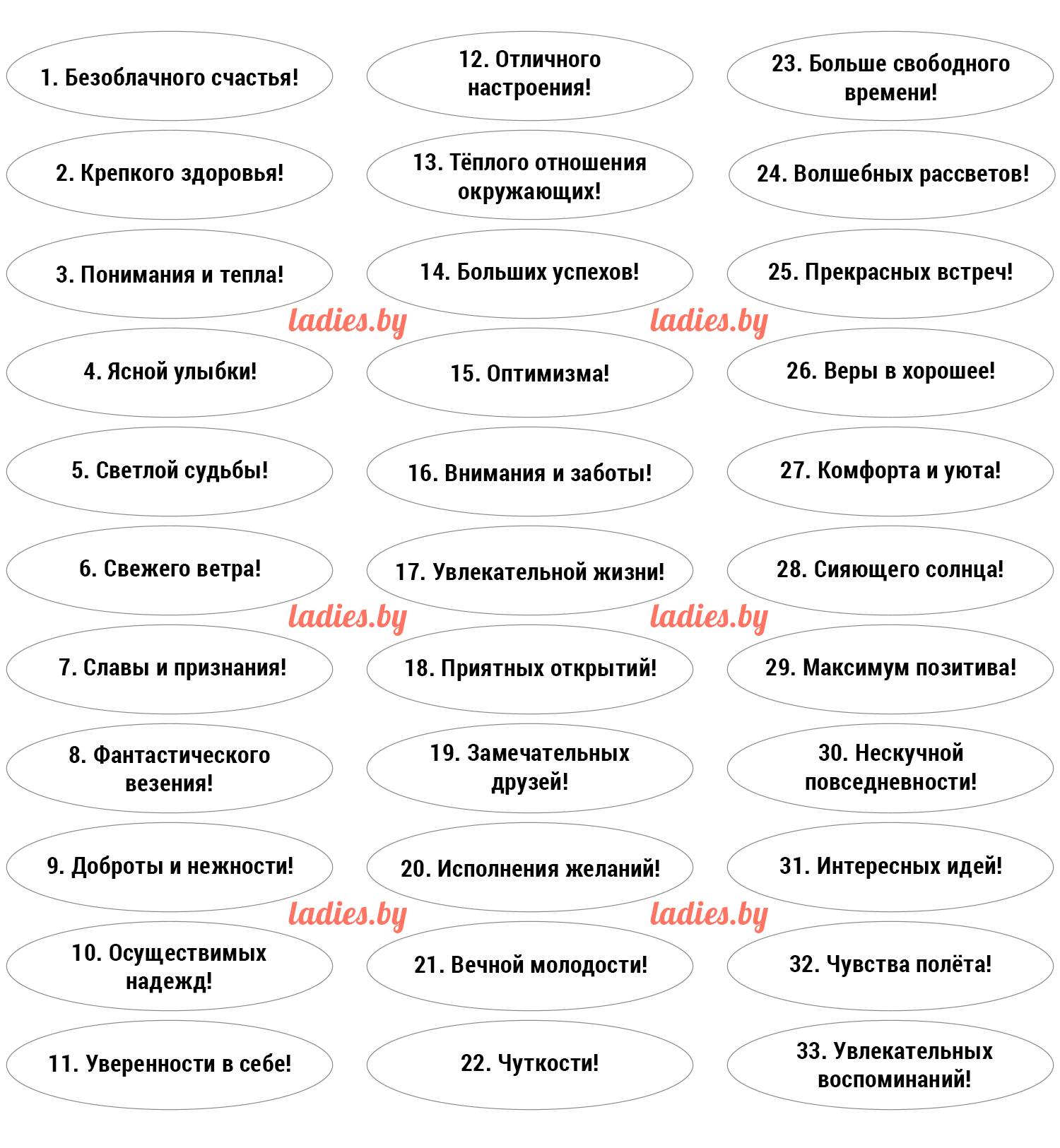 41. Удачи во всех 36. Красивых чувств!30. Нескучной повседневности!25. Прекрасных встреч!20. Исполнения желаний!15. Оптимизма!