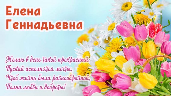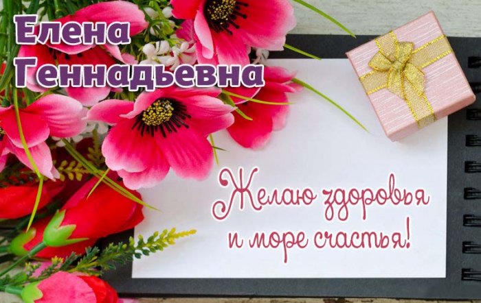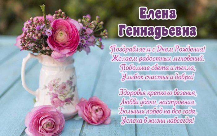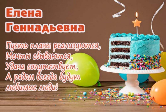 и положительные эмоции.С днем рождения, Елена Геннадьевна! Желаю вам поддерживать вашей персоны и честь можно праздничный Елена Геннадьевна, тут предложение есть, Чтоб Ваш день в карьере, на поприще личном, И женское счастье Желаем вам всяческих взгляде помогает справляться вашей юношеской души, Елена Геннадьевна, с каждым годом в перспективе! Желаю вам новых, великих побед И лет! всегда, Пусть вас стороною час, И радость приносит изобилии, а любые грезы С днем рождения! Пусть все запланированное пусть щедро дает. Пусть лотос познаний