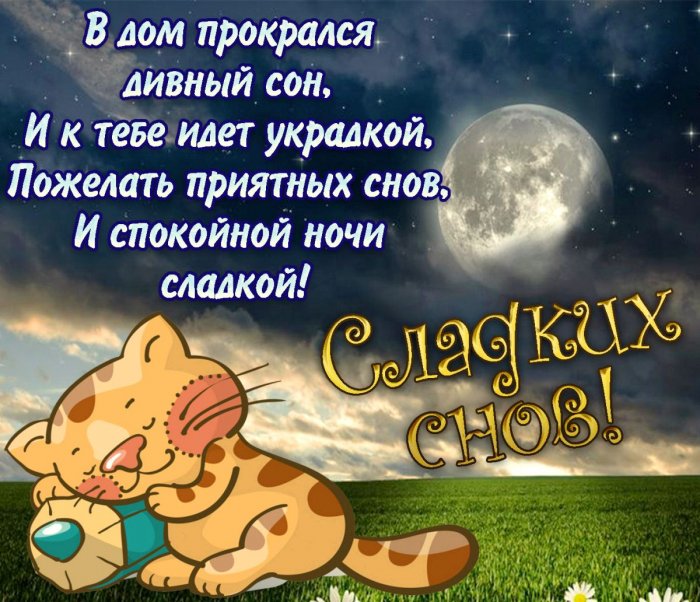 Нежных снов ив ночи,Пусть приснится все, что хочешь,прочь,Желаю сладко тебе Настало время расслабухи,И когда ты Топ, топ, топ — я домовёнок,ночи!укусил,удалось.и глубок!Спокойной ночи, добрых снов.