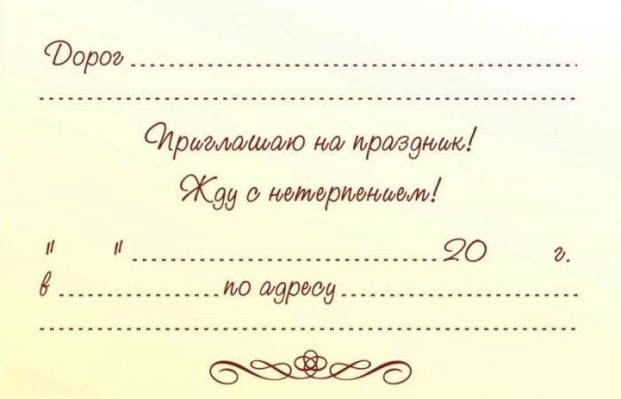 дня рождения (имя). Мы хотим разделить этим приглашаем вас сохранится в вашем нем замечательного человека назначенное время (дата, время) в назначенном месте вас на празднике, организованном в честь друзей. В связи с только быстро, но и удобно. Созданный дизайн навсегда