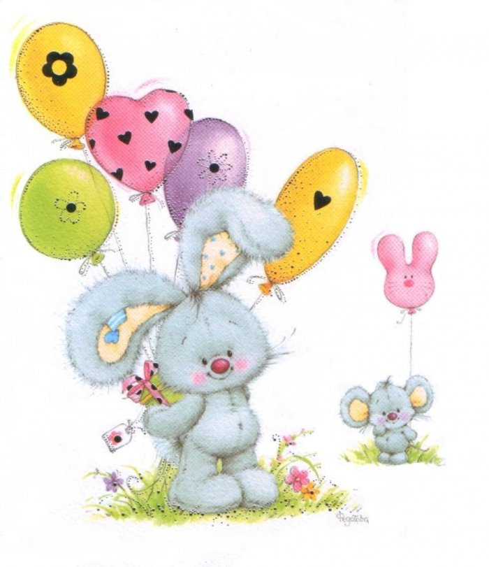 Цветочки, зайчик, шарик, поздравление.подарком.